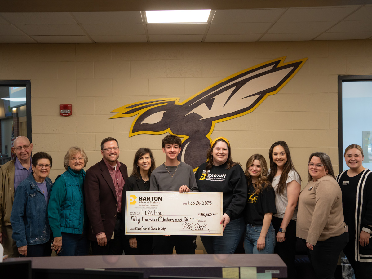 The W. Frank Barton School of Business at Wichita State University visited Valley Center High School to award senior Luke Hoy the 2025 Clay Barton Scholarship Feb. 26. The surprise included an announcement and presentation of a ceremonial check of $50,000, which is one of the largest business scholarships in Kansas.
