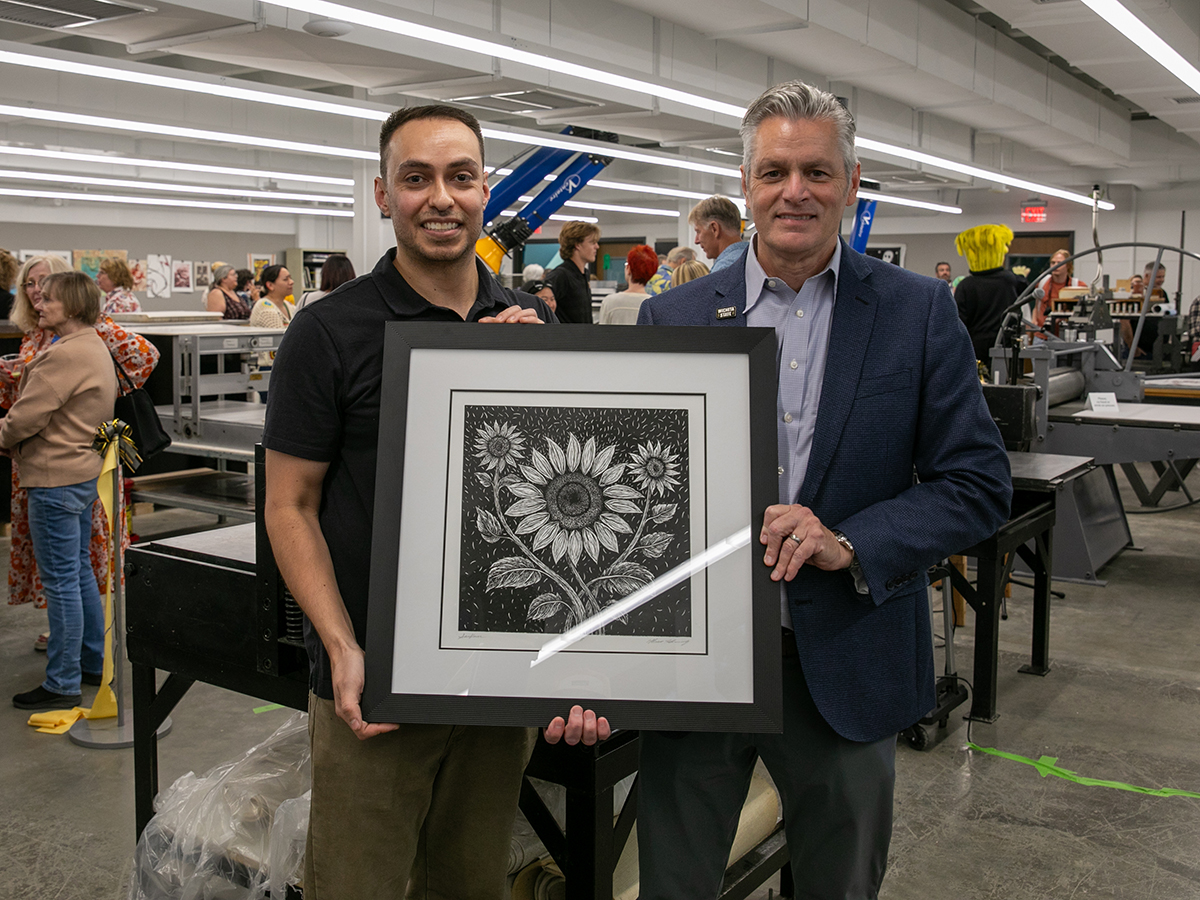 Beyond the studio, Hernandez organizes the annual First-Generation Artist Exhibition in the Rhatigan Student Center’s Cadman Gallery. He also leads the student printmaking organization, Tornado Alley Press, which is known for its public demonstrations, visiting artist lectures and the annual Steamroller Printmaking Event that uses a literal paving steamroller to create large-scale prints.