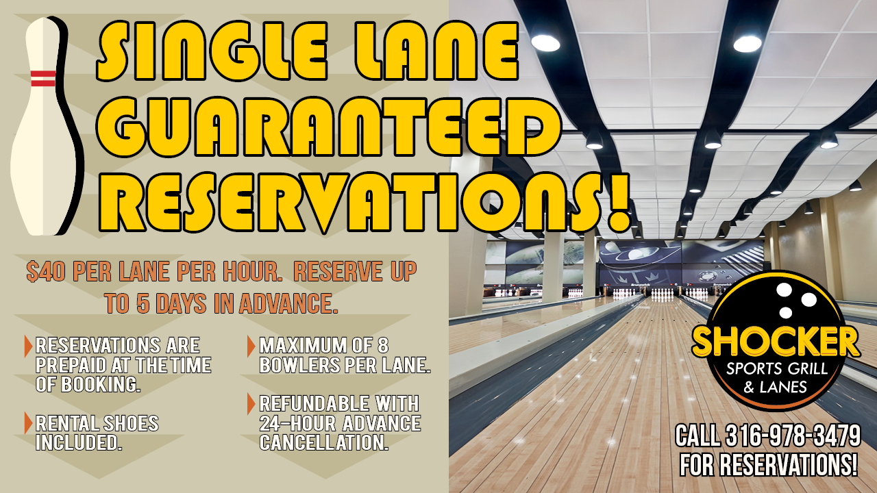 Rental shoes are included! Reservations can be made by phone (316-978-3479) and payment is due at the time of booking (refundable with 24-hour notice). Click here for all bowling options!