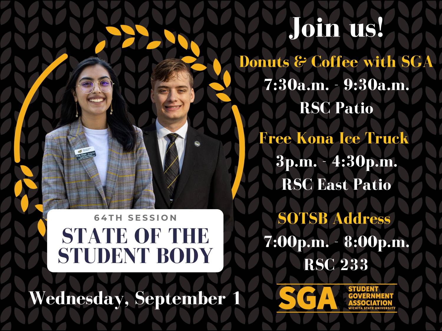 Wichita, KS – On September 1st, 2021, the Student Government Association will be holding a special day of events to celebrate our annual State of the Student Body Address. This day will include free donuts and coffee with SGA in the morning, free Kona Ice Truck in the afternoon, and the State of the Student Body Address in the evening with refreshments and mingling following the address.