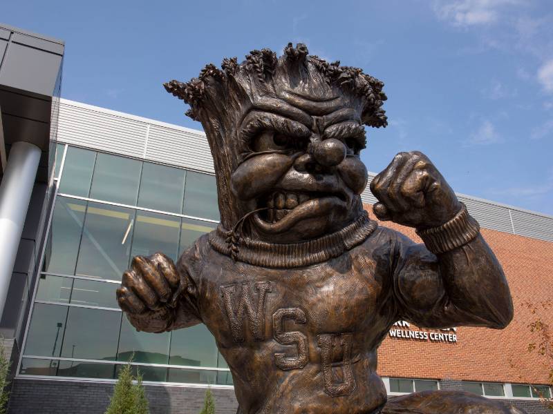 A first-of-its-kind WuShock sculpture was unveiled and dedicated Sept. 15, at the entry plaza of the Steve Clark YMCA and Student Wellness Center. The 8-foot bronze sculpture is the creation of local artist Wade Hampton, who worked with WSU Athletics and Clark to capture his vision in sketch form, and local artist Connie Ernatt, who transformed the drawing to the final bronze sculpture.