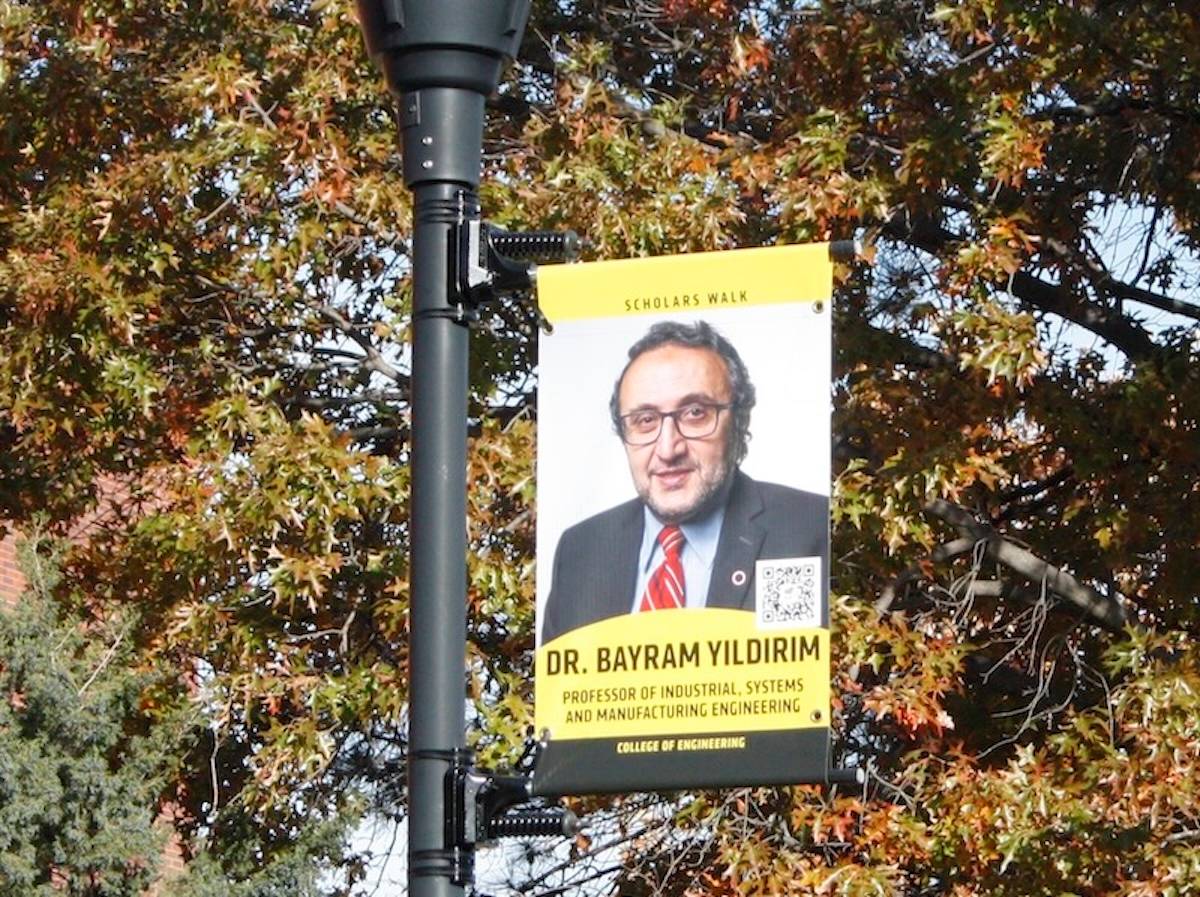 Installed this month, the Scholars Walk is a series of banners along the northeast walkway from the Plaza of Heroines to Heskett Center highlighting faculty from each of WSU’s academic colleges. Each banner includes a QR code that links to a biography and additional information on each faculty member’s scholarly work.