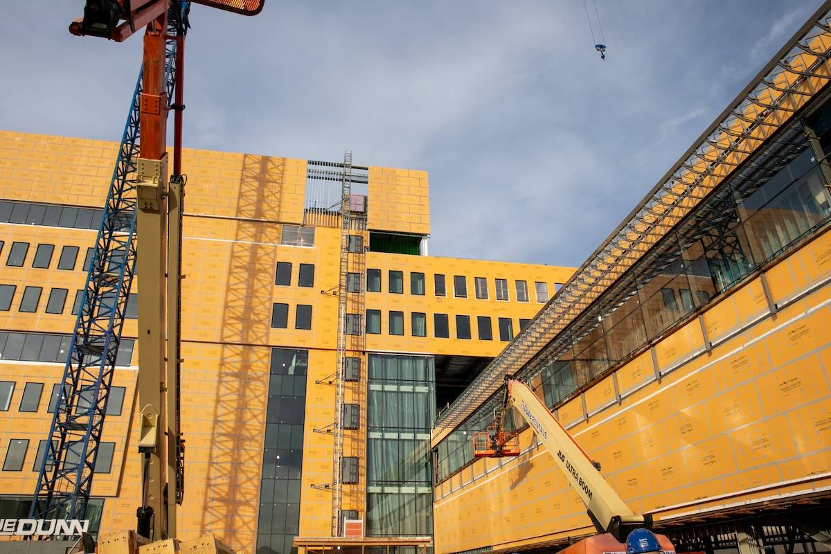 Terracotta cladding, metal panels and ultra-high performance concrete panels will soon cover the orange backup wall panels now visible on much of the nine-story building’s exterior. With the building around 85% enclosed, interior work is beginning with drywall, painting and tile.