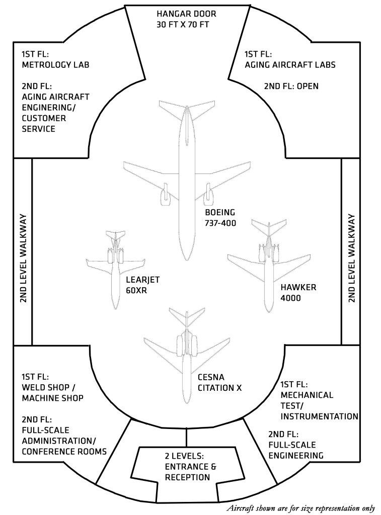 The facility has a clearance height of 48 feet and clear span of more than 240 feet. This will allow testing and research on aircraft including unmanned aerial vehicles, business jets, commercial aircraft and military aircraft.
