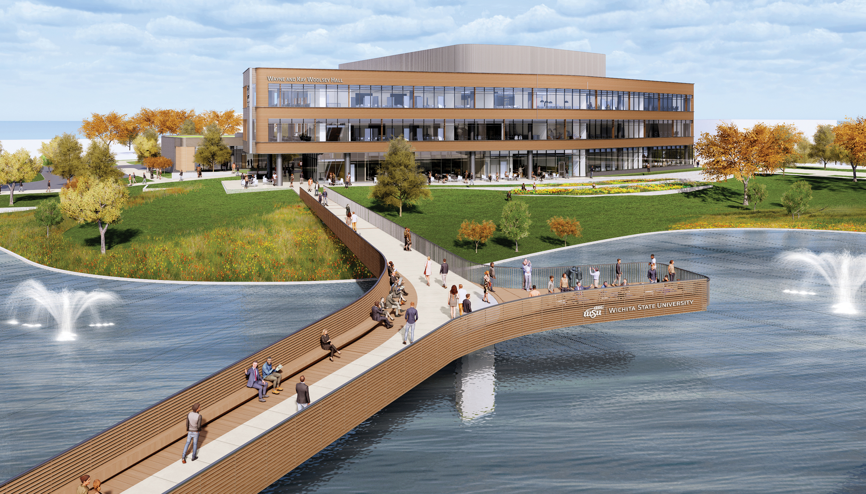 The marquee exterior fixture of the W. Frank Barton School of Business’ new home, Wayne and Kay Woolsey Hall, has been officially named the Promise Bridge. The 300-foot-long pedestrian bridge will span over a water feature south of the building.