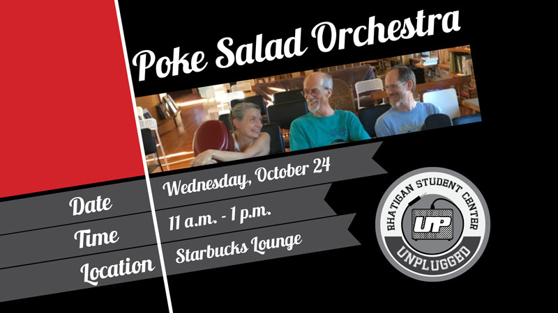 Stop by the Rhatigan Student Center every Wednesday for the live music series, RSC Unplugged. Poke Salad Orchestra will perform from 11 a.m.-1 p.m. today (Wednesday, Oct. 24) in the RSC's Starbucks Lounge. Grab a cup of coffee and relax with some great music!