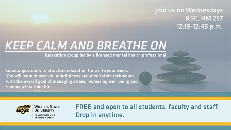 Join the Counseling and Testing Center for Keep Calm & Breathe On. Drop in to build structured relaxation time into your life and learn techniques to do relaxation on your own. You will be led in meditation, mindfulness and relaxation practices. The meetings are from 12:15-12:45 p.m. every Wednesday in 257 RSC. Drop in or contact the Counseling and Testing Center for more information at 978-3440.