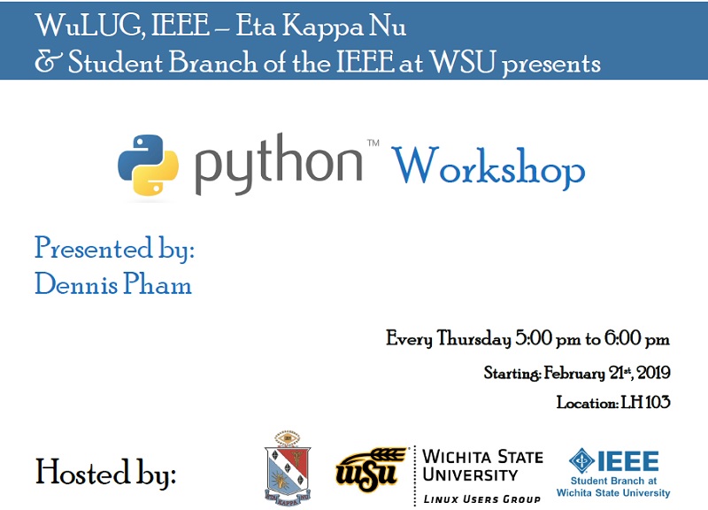The IEEE HKN Epsilon Xi Chapter and WuLUG are organizing a workshop on programming using Python from 5-6 p.m. every Thursday starting Feb. 21, in 103 Lindquist Hall.