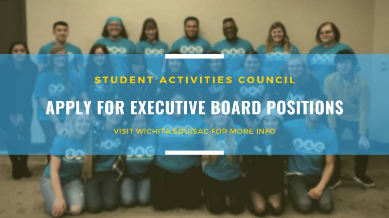Student Activities Council (SAC) has open executive board positions for the 2019-20 academic year! SAC is the largest student organization that offers opportunities for leadership, professional development, and collaboration. Applications can be found at wichita.edu/SAC. Officer applications close on Wednesday, March 27, while chairperson applications close on Wednesday, April 10.