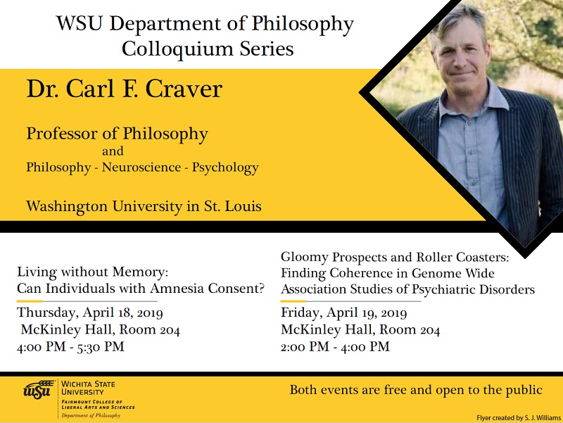 Craver will present “Living Without Memory: Can Individuals with Amnesia Consent?,” from 4-5:30 p.m. Thursday, April 18, in 204 McKinley Hall.