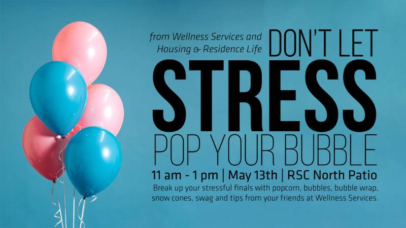 Come join Wellness Services (Prevention Services, Student Health, and Campus Recreation), and Housing and Residence Life from 11 a.m.-1 p.m. Monday, May 13, on the RSC north patio for fun ways to decrease your finals stress! Blow bubbles, pop bubble wrap, eat popcorn, enjoy snow cones, and take some time to have fun this finals week.