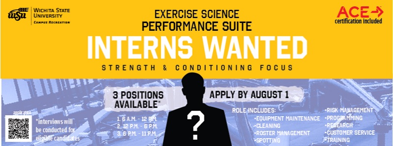 Campus Recreation is looking for three Exercise Science interns with emphasis in strength and conditioning. The three spots will fill the timeslots of Monday-Friday 6 a.m.-noon, noon-6 p.m., and 6-11 p.m.