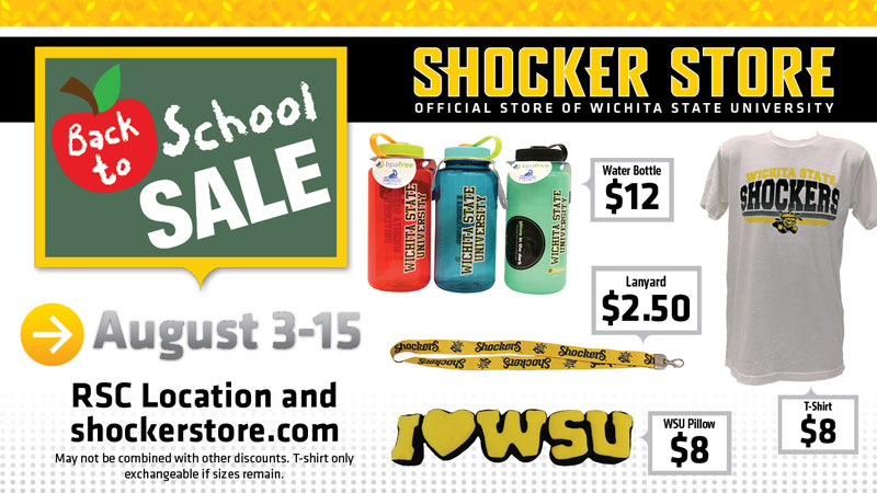 Looking to find some Shocker gear for the start of school? The Shocker Store is having a Back to School Sale from now to Saturday, Aug. 15 in the RSC store and at shockerstore.com. It features select products at awesome prices! May not be combined with other discounts.