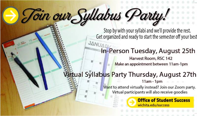 First-Year Programs in Student Success invites you to join our Syllabus Party on Tuesday, Aug. 25 in person, or online on Thursday, Aug. 27. Bring your class syllabi and your planners (electronic or paper) and we will provide the rest.