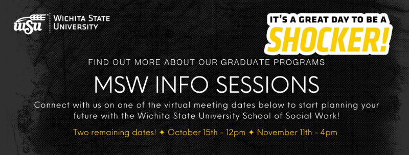 The School of Social Work is hosting three MSW Info Sessions to help prospective students discover more about the Master of Social Work program at Wichita State University. This is geared to both social work majors and for those with majors outside of social work. We encourage you to share this with your students and recent graduates of all majors!