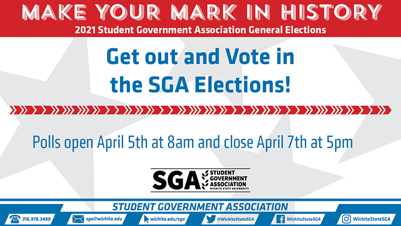 SGA Election Polls open at 8 a.m. today and close at 5 p.m. on Wednesday, April 7. Make your voice heard in this year's election by voting for your senatorial candidate, student body president, vice president candidate, and amendments to the SGA Rules and Regulations. Ballots will be sent electronically to your Shocker email. For more information visit wichita.edu/sgaelections or email us directly at sga.elections@wichita.edu.