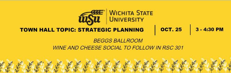 Please plan to attend the Town Hall from 3-4:30 p.m. this Thursday in the Shirley Beggs Ballroom at the RSC. Continue to stay abreast of this work at wichita.edu/strategicplan.