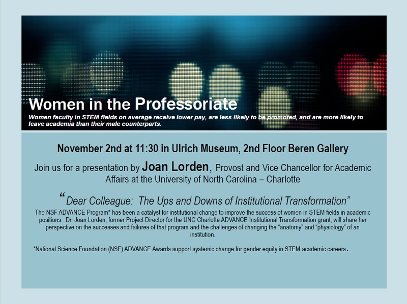 Women faculty in STEM fields on average receive lower pay, are less likely to be promoted, and are more likely to leave academia than their male counterparts. Come for a presentation by Joan Lorden, provost and vice chancellor for Academic Affairs at the University of North Carolina-Charlotte at 11:30 a.m. Friday, Nov. 2, in the Ulrich Museum, second floor, Beren Gallery.