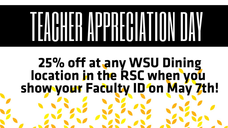 Celebrate National Teacher Day today (Tuesday, May 7), with 25% off at any WSU Dining location in the RSC when you show your WSU faculty ID!