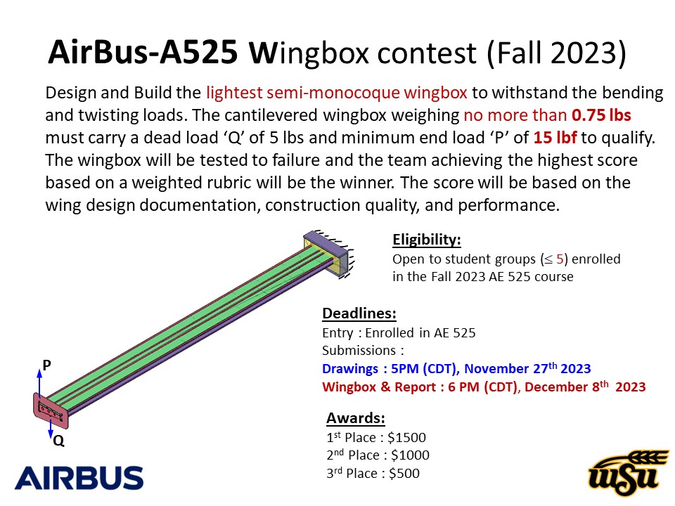AE 525 Category - Open to undergraduate and graduate students enrolled in the WSU AE 525 flight structures course. The wing-box design challenge will be mandatory for students enrolled in this course. Airbus representatives will be invited to provide guest lecture(s) encompassing practical aspects of designing airframe structures in this course. This category will have a time constraint of one semester. As part of the deliverables, teams will provide a power point-style report at the end of the semester.