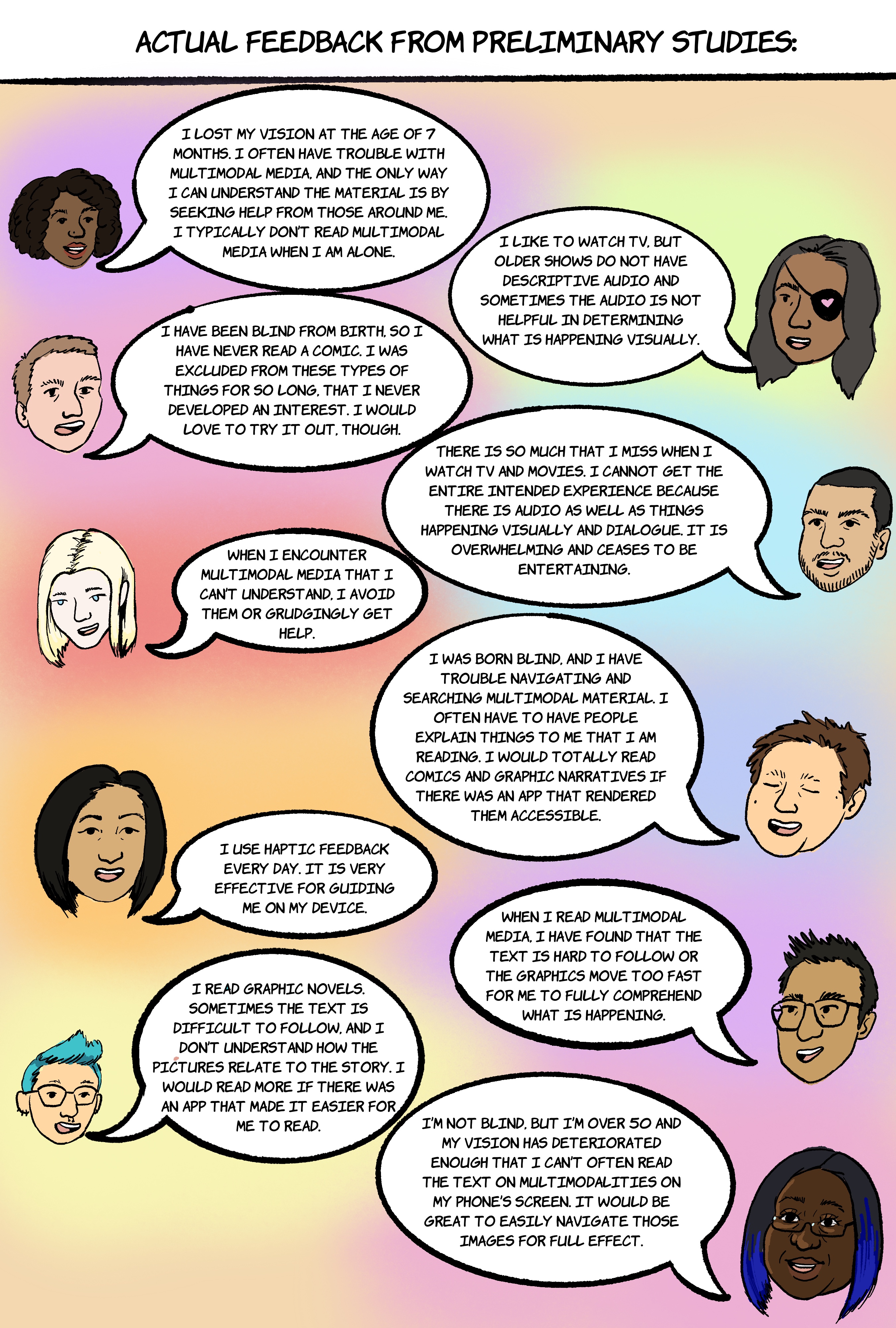 A man explains: “I was born blind, and I have trouble navigating and searching multimodal material. I often have to have people explain things to me that I am reading. I would totally read comics and graphic narratives if there was an app that rendered them accessible.”