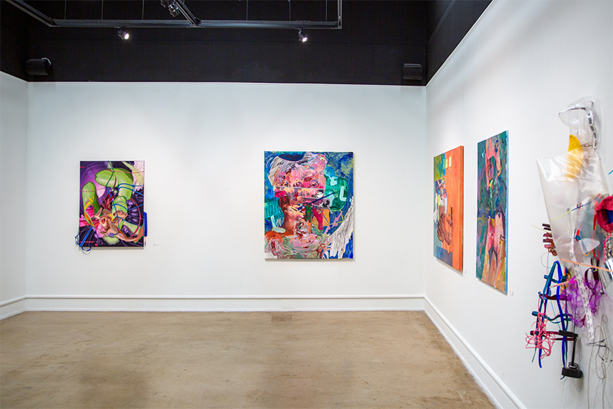 Using a mixture of painting language and wall oriented installation, my work is pursuing the ways that these worlds feel two dimensional yet rich in depth. I've taken inspiration from Sarah Sze, David Altmejd, and Robert Rauschenberg to play with the connections between disparate contexts, objects, and appropriated images of pornography to play with the idea that the queer community currently exists in a kind of maximalist liminal space. The wonder experienced by traversing this landscape gives way to a darker less stabilized structure that can make its participants feel lost and less secure in their own identity. In many ways this loss of ego is the freedom we've been searching for.