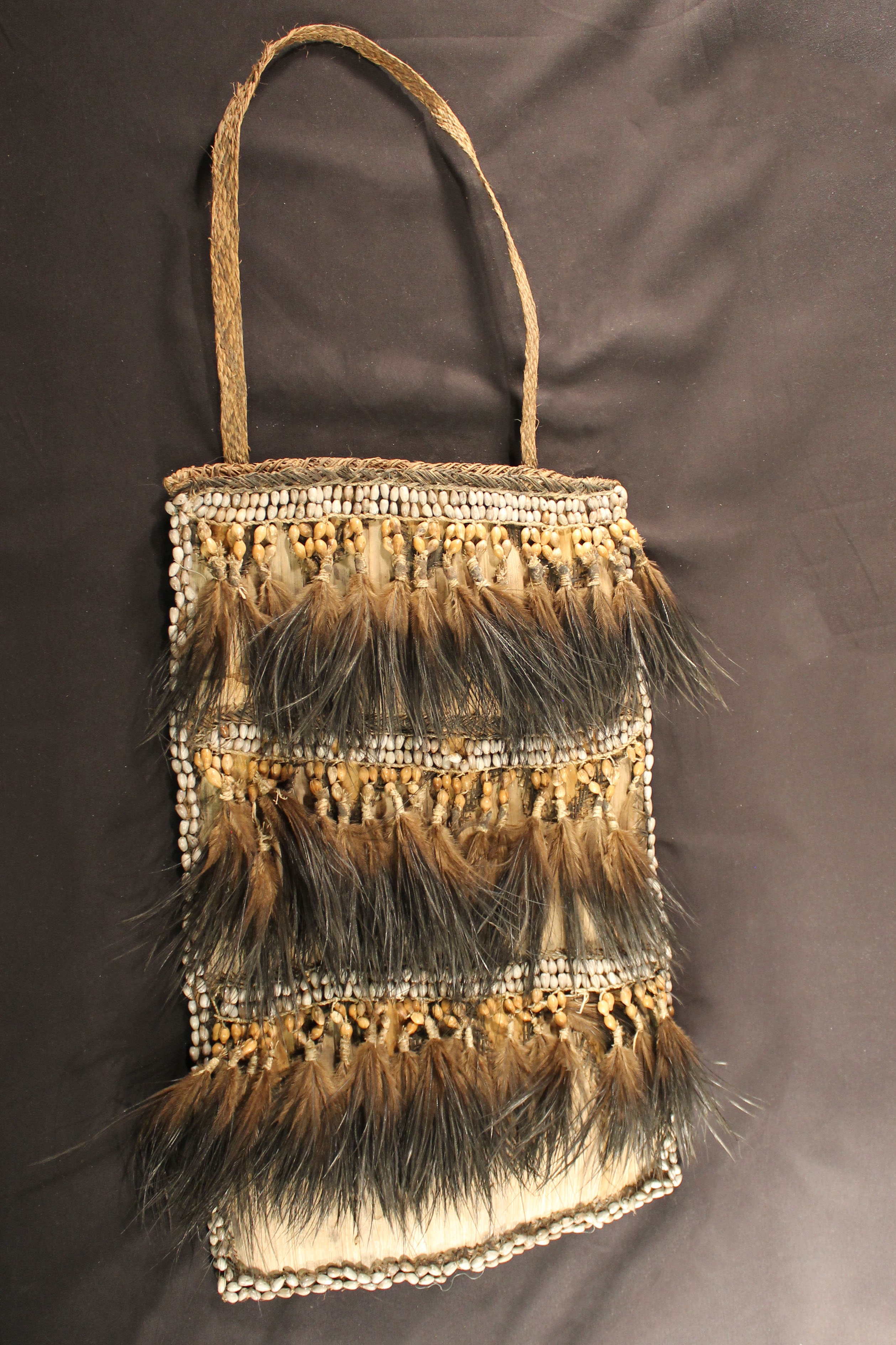 Bags woven from sago palm fronds. Decorated with pigments and feathers, bags are important status symbols for the Asmat.