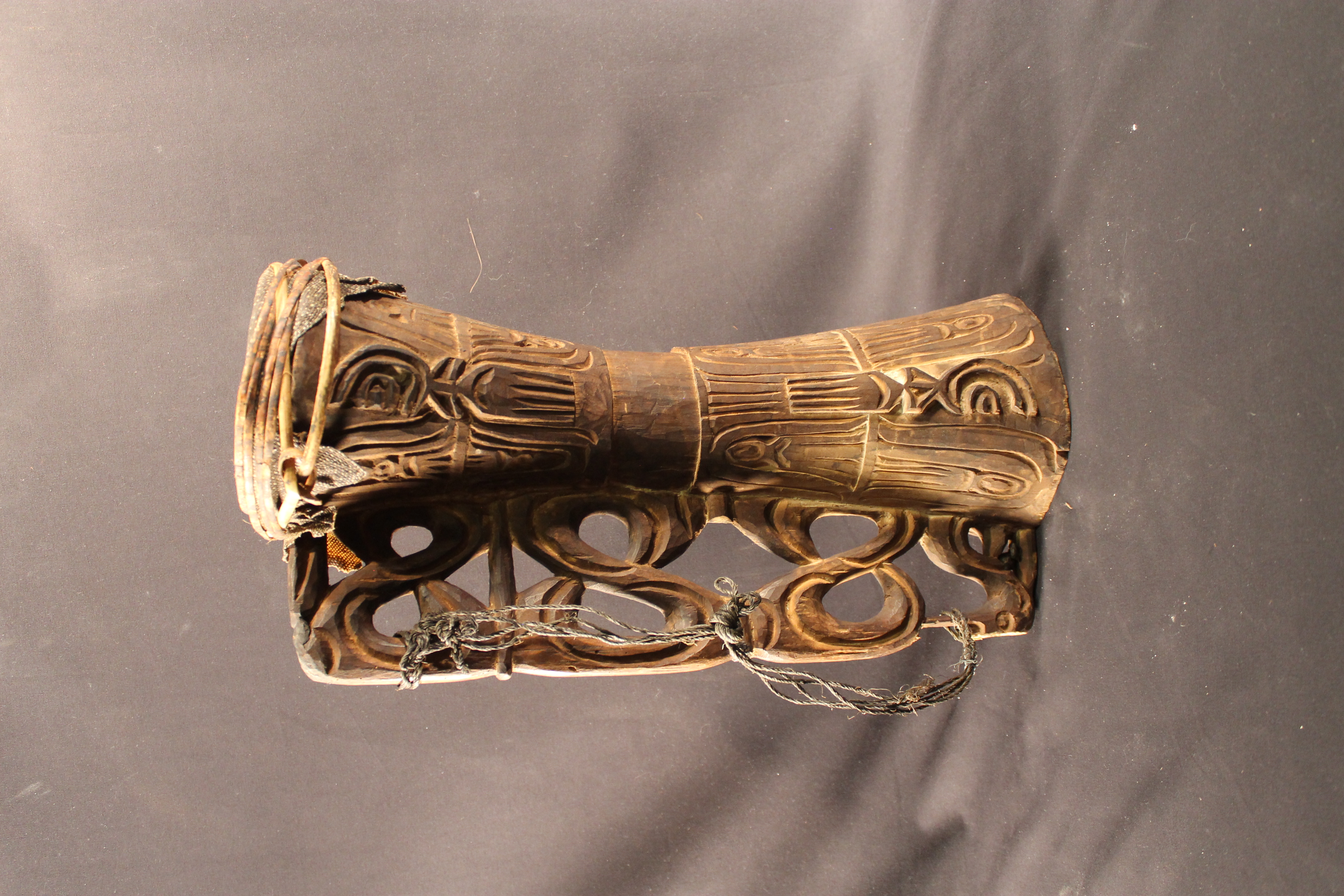 Carved wooden drums with lizard skin heads. Drums are the main instruments used in Asmat ceremonies.