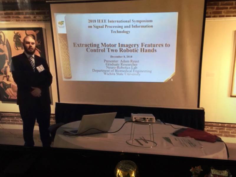 - Adam Reust presented his research on "Extracting Motor Imagery Features to Control Two Robotic Hands" at the 2018 IEEE International Symposium on Signal Processing and Information Technology on Dec 8, 2018, Louisville, KY. (Dec 2018)