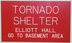 In the event of a tornado warning, move to the lowest level of the building and seek shelter immediately. Every building on campus has a designated tornado shelter area marked by red signs giving specific directions.