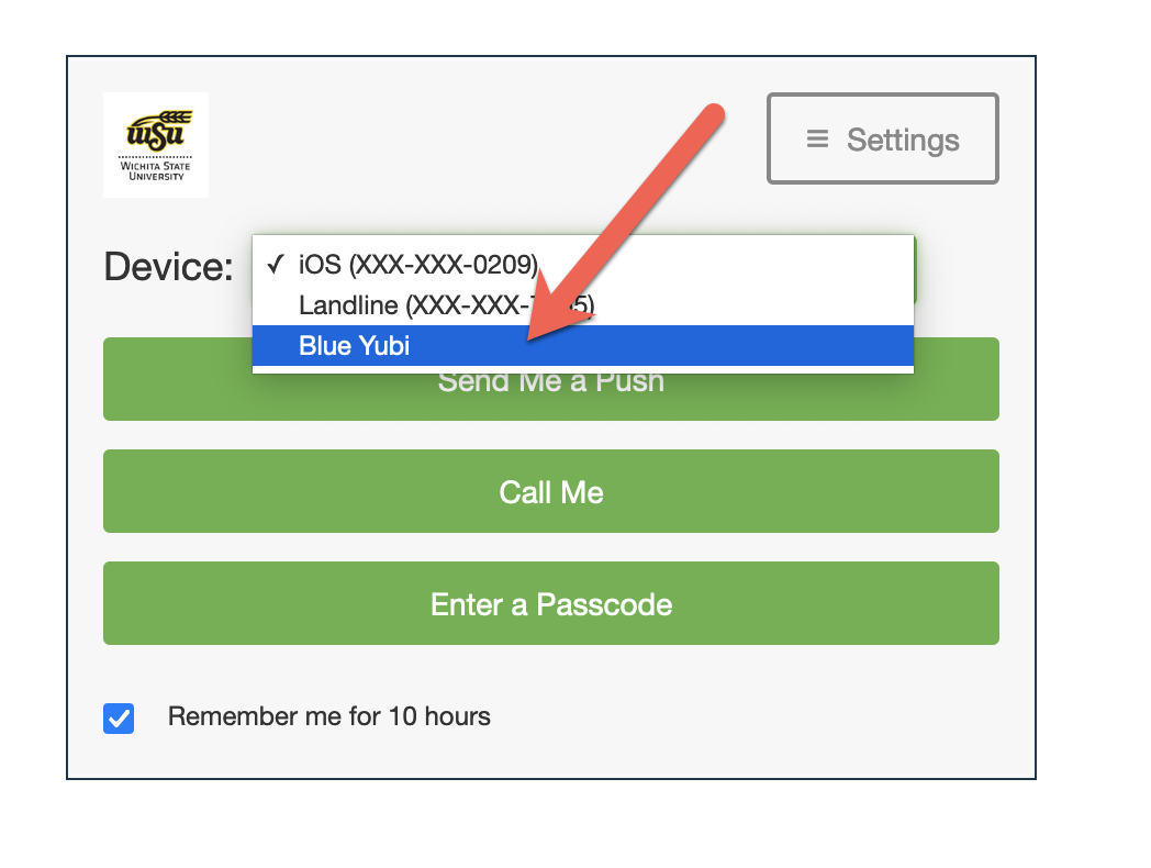 - Once you successfully link your key to Duo and name it if you choose to, you will be able to use it in any browser or on any device to Duo authenticate into Wichita State's systems, although you should check that it works properly before you rely on your key. To use your key to unlock the Duo authentication step, it must be inserted in the device you are attempting to authenticate first. Then, you need to choose your key from the available options when you are logging in and then touch your key with any finger: