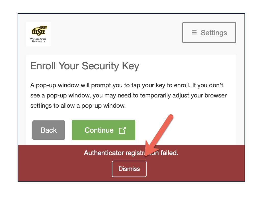 - At this point, you will be asked to enroll your security key. While this is a simple process most of the time, sometimes the system will refuse to enroll a key at first. If this happens to you, know that you are not alone. Simply try repeating the process until it works. When you see a popup box that says "Enroll Your Security Key," read it and then click "Continue":