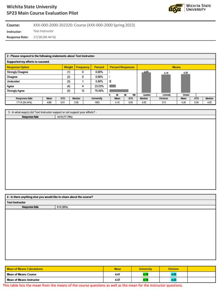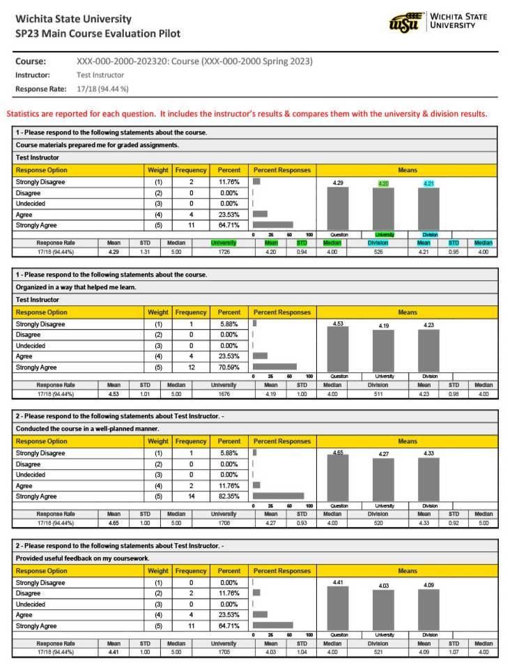 Will there be any benchmarks noted on the results? Yes. Results will include the mean, standard deviation, and median by university and by division. This benchmark data will be from the same semester as the evaluation and not include any other data.