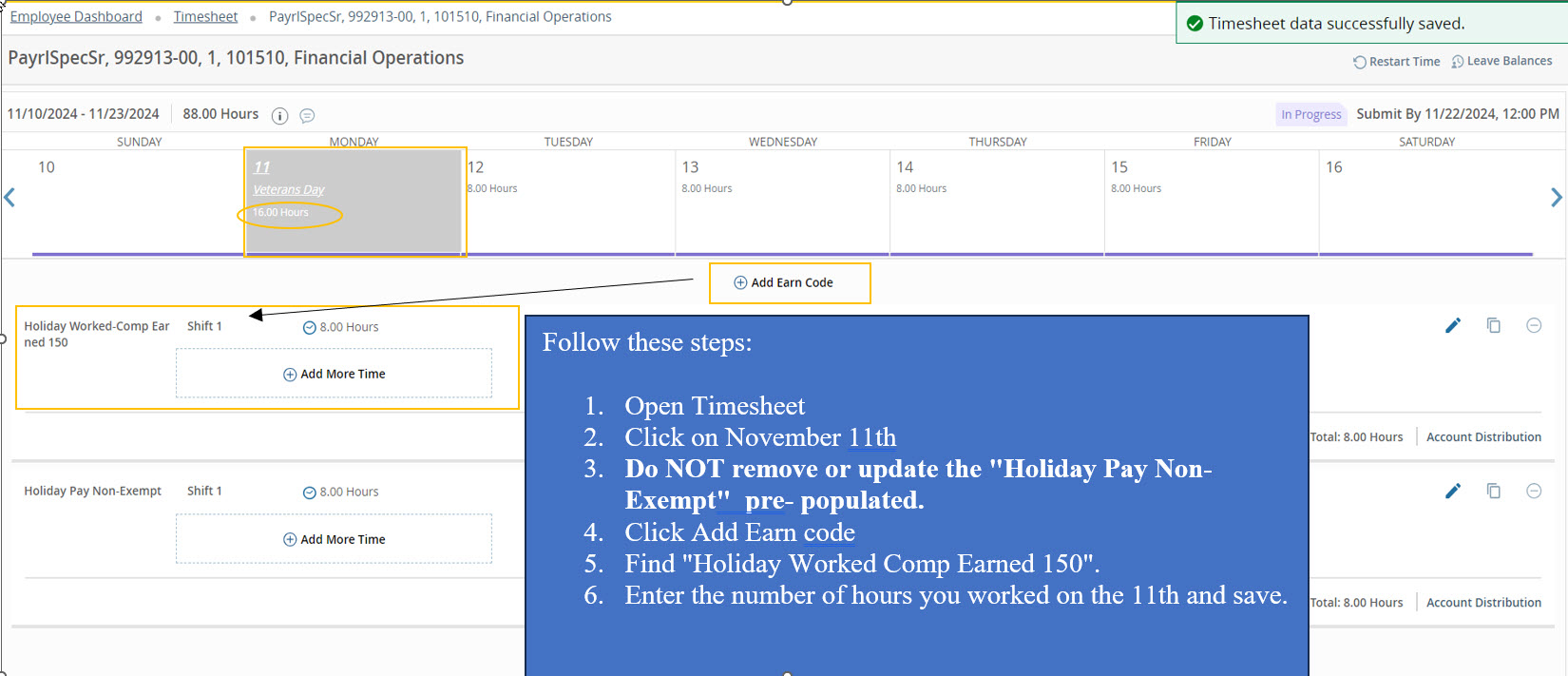 If you work on Veterans day and need to earn Comp Time for these hours.