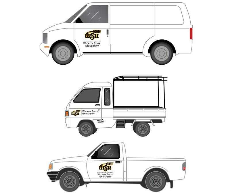 The Wichita State institutional logo translates well to fleet graphics and serves to unite a diverse array of different fleet vehicles while providing an effective exposure for Wichita State's identity. In some instances, the preferred horizontal institutional logo may not be ideal for logo size and proportion. in those cases, switching to the vertical institutional logo is allowed if doing so allows for a larger and more prominent visual impression. On all vehicles, the institutional logo is required on the driver and passenger side doors. Wichita State fleet vehicles should be white with horizontal (preferred) or vertical configurations of the institutional logo in all black or black and Shocker Yellow™.